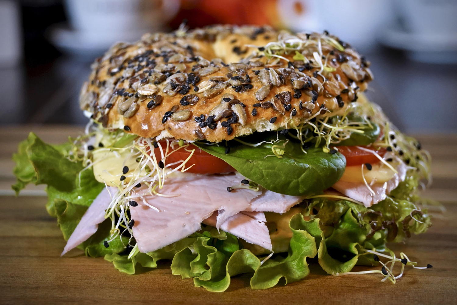 (ciabata aux olives et tomates, thon, moutarde a l’ancienne, avocado, ciboulette, lettuce, crispy bacon)